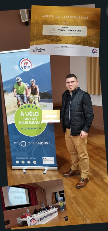 Lors de la partie Récompenses Fédérales, un de nos adhérents, Kévin CHAMPIGNY a reçu le diplôme du "Mérite du Cyclotourisme".